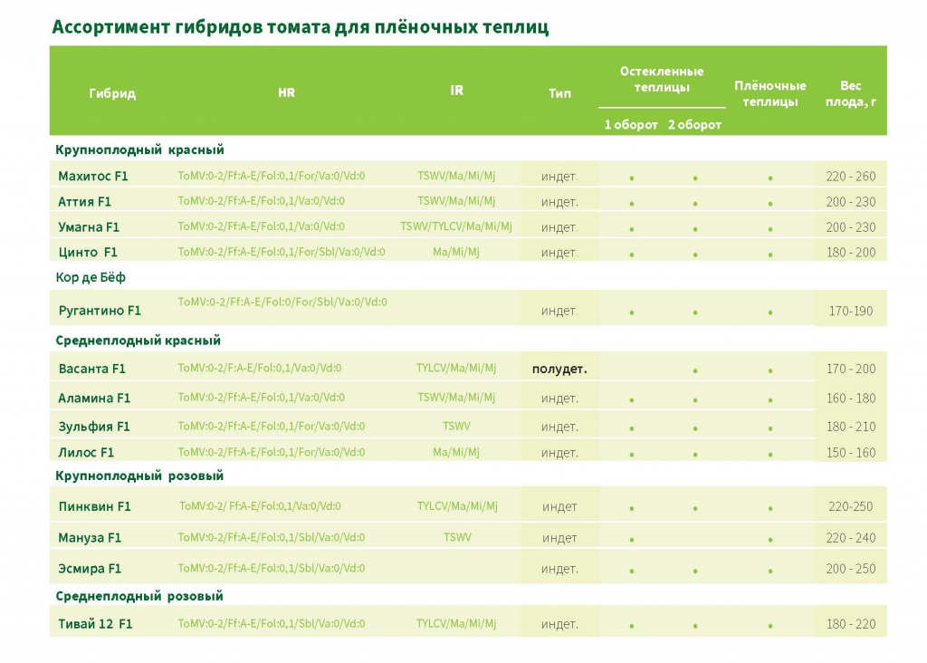 Ассортимент гибридов томата для пленочных теплиц